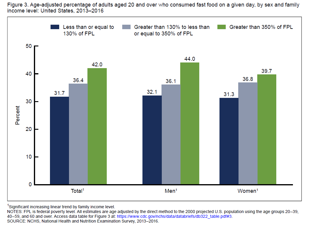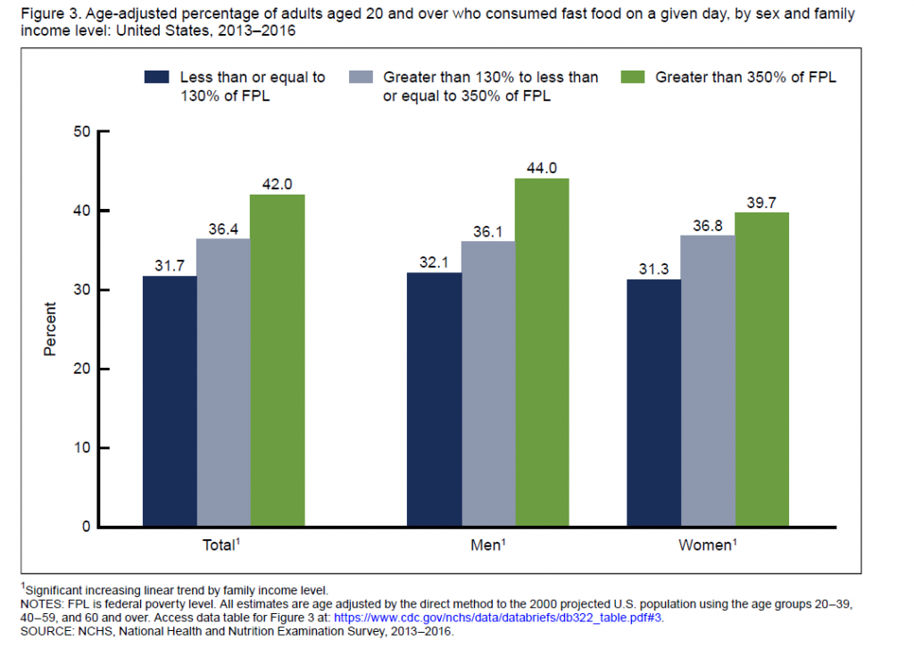 First, as a person trained in public health, I have been taught that people consume more fast food if they have lower incomes, in part because fast food is most affordable and available to them. This data brief indicates the relationship between income and fast food consumption goes the other way. That is, people with higher incomes ate fast food more frequently than people with lower incomes as shown in the chart below.